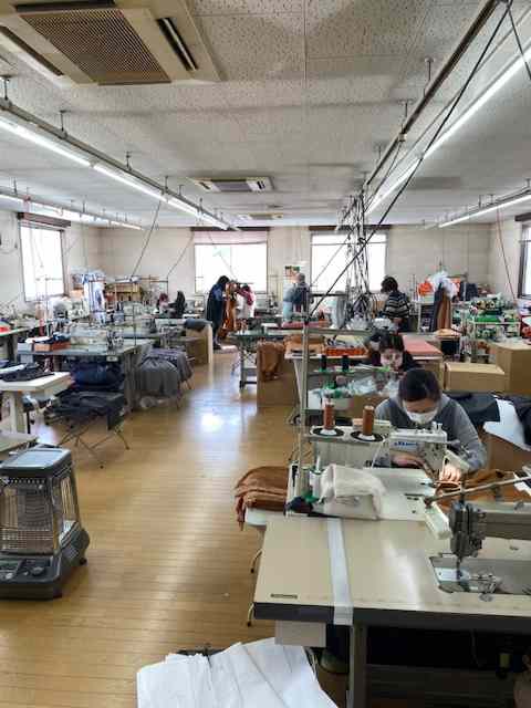 型入→生地裁断→接着→縫製→縫製→中間プレス→検査→出荷